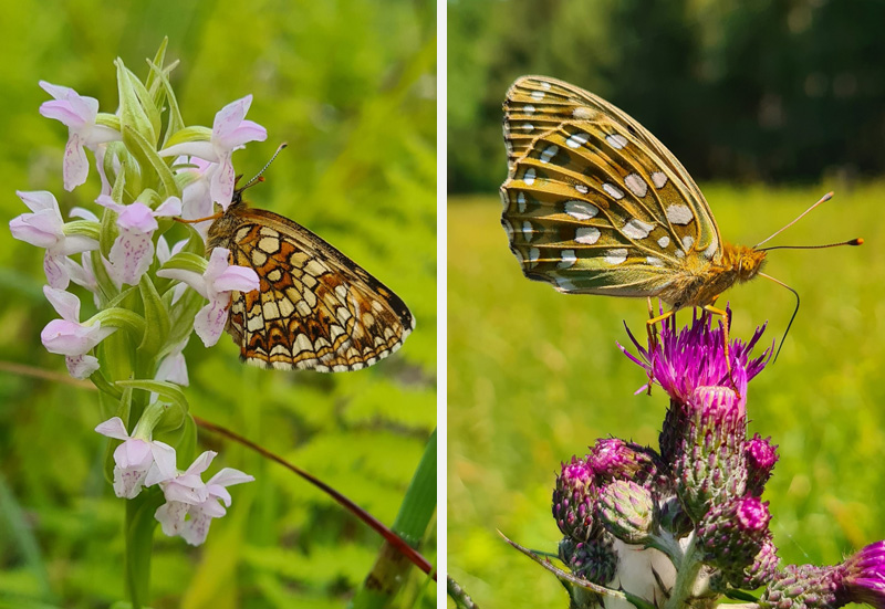 Abb. 10: Steifblättriges Knabenkraut (Dactylorhiza incarnata) mit einem Falter des Baldrian-Scheckenfalters (Melitaea diamina), Möllnsee , 05.06.2024 (Foto: S. Fuchs)