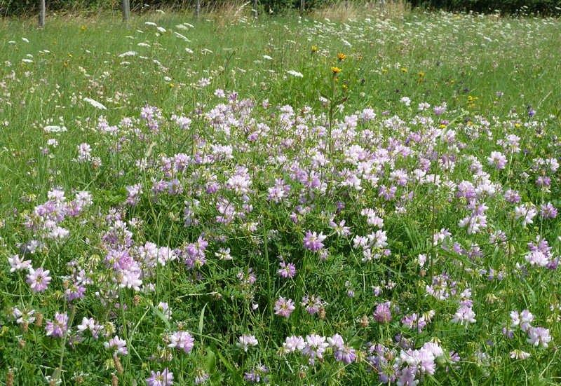 Abb. 19: Bunte Kronwicke (Securigera varia) auf einem basenreichen Trocken- und Halbtrockenrasen mit einem individuenreichen Vorkommen des Silbergrünen Bläulings (Lysandra coridon), Südostrand von Seelow, 21.07.2017 (Foto: J. Gelbrecht)