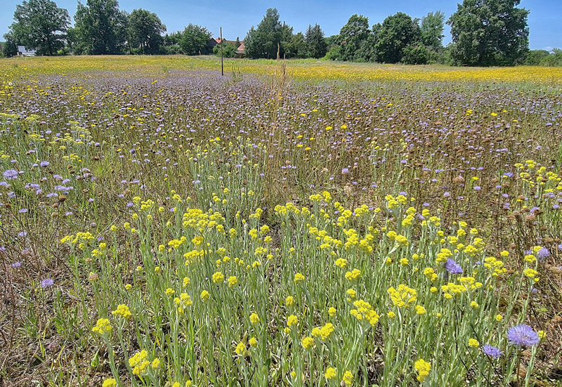 Abb. 22: Sandtrockenrasen bei Krausnick mit großen Beständen von Sand-Strohblume (Helichrysum arenarium) und Berg-Sandglöckchen (Jasione montana), 29.06.2024 (Foto: S. Fuchs)