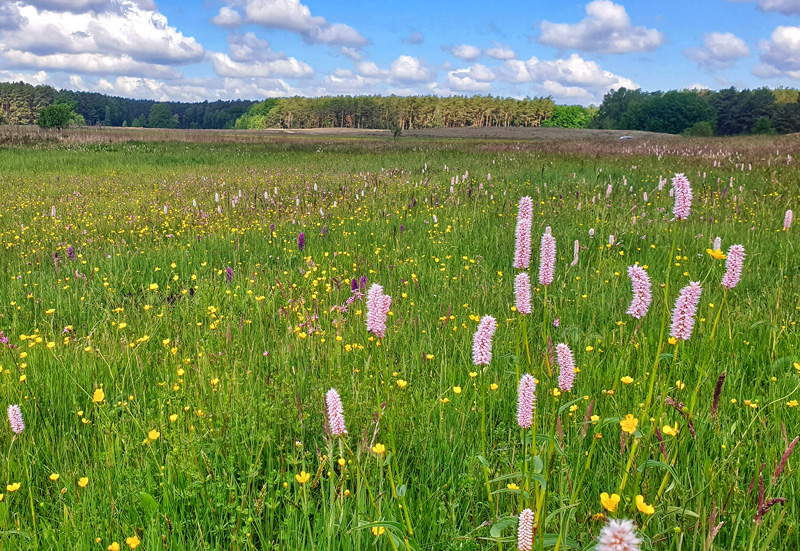Abb. 5: Schwach entwässertes Durchströmungsmoor bei Freidorf bei Halbe mit größeren Beständen von Breitblättrigem Knabenkraut (Dactylorhiza majalis), Schlangen-Knöterich (Bistorta officinalis) und vielen anderen Blühpflanzen, 26.05.2020 (Foto: S. Fuchs)