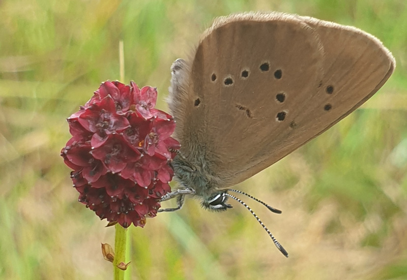 Abb. 7: Der Dunkle Wiesenknopf-Ameisenbläuling (Maculinea nausithous) auf einer Blüte von Großem Wiesenknopf (Sanguisorba officinalis), 27.07.2022 (Foto: M. Luck)