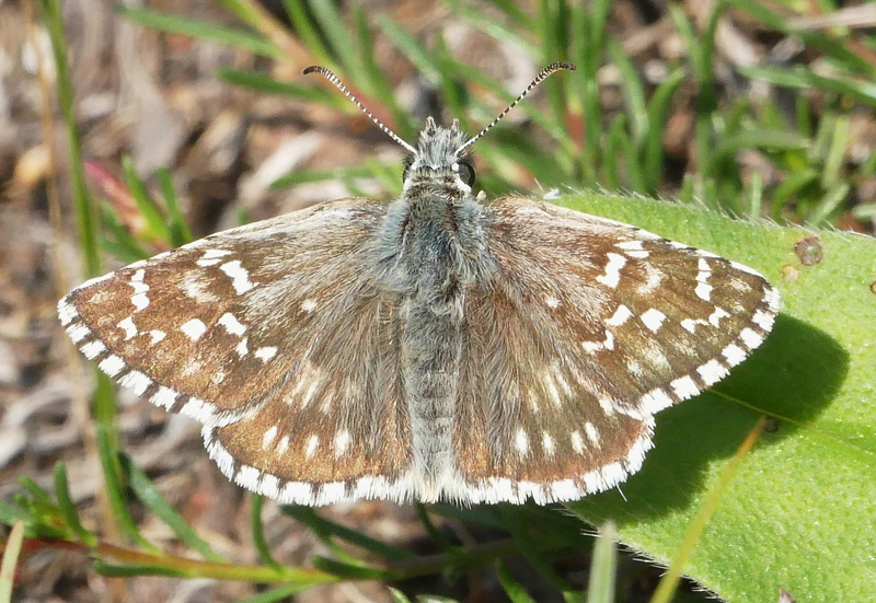 Abb. 2: Steppenheiden-Würfel-Dickkopffalter (Pyrgus carthami), eine Art der basenreichen Trocken- und Halbtrockenrasen, Kyffhäuser-Südhang (Thüringen), 1.6.2018 (Foto: I. Seidel), 1983 letzter Nachweis in Brandenburg