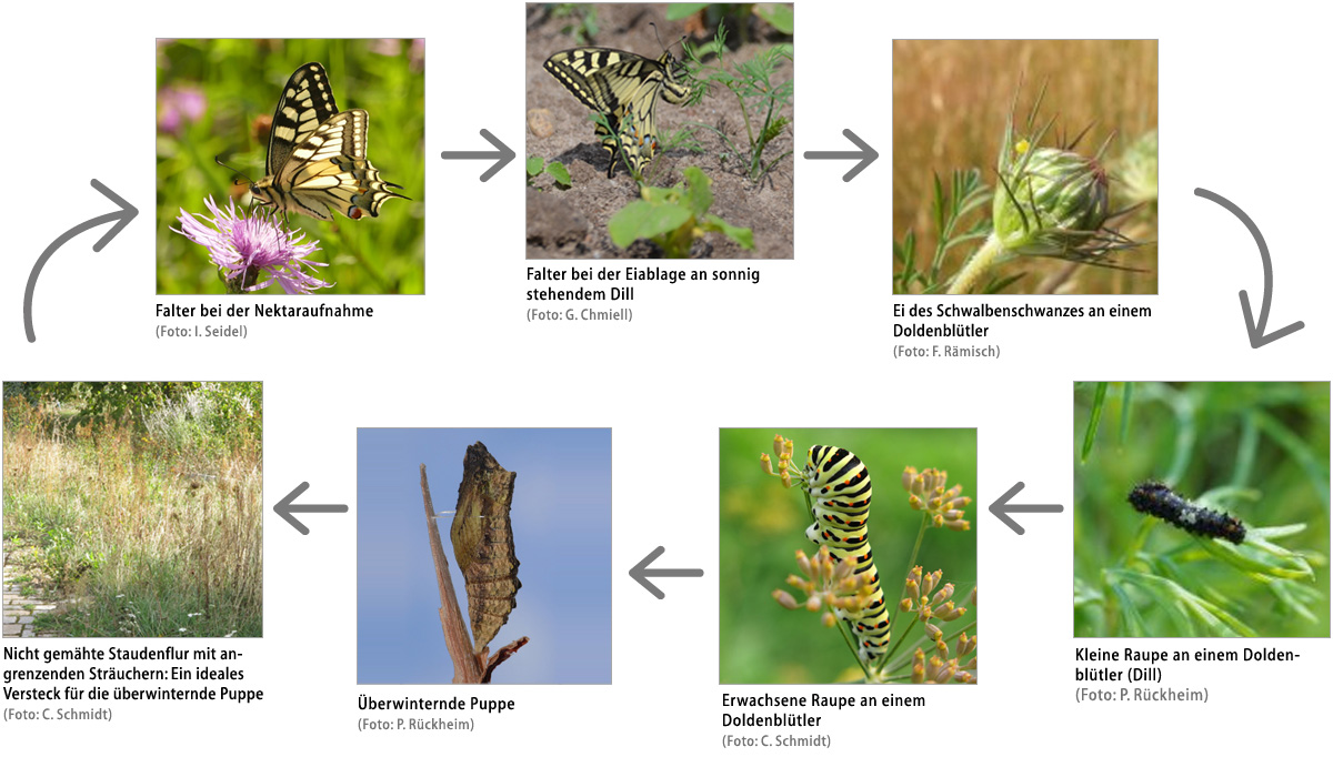 Abb. 4: Lebenszyklus einer Schmetterlingsart am Beispiel des Schwalbenschwanzes: Für eine erfolgreiche Entwicklung dürfen die Larvallebensräume vom Zeitpunkt der Eiablage bis zur Verpuppung nicht gemäht oder beweidet werden. Die Raupen müssen die Chance haben, sich in angrenzenden Hochstaudenfluren oder Hecken/Sträuchern verpuppen zu können. Hier muss sie sich gut tarnen, um nicht von Prädatoren in der Zeit von August bis in den April/Mai des nächsten Jahres gefunden zu werden. Eine Mahd solcher Hochstaudenfluren vom Sommer bis zum nächsten Mai würde sämtliche darin befindliche Puppen vernichten.
